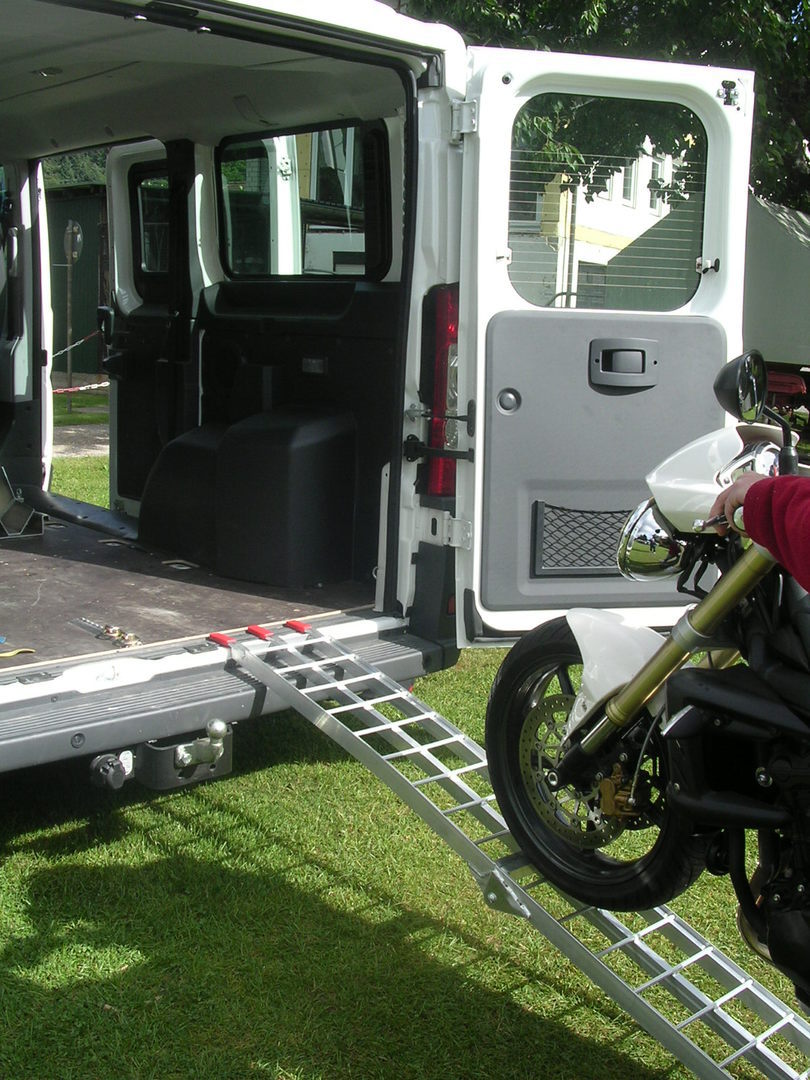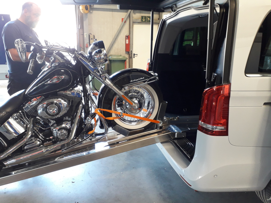 Das Motorrad wird in den Wagen mit Radwippe geschoben.