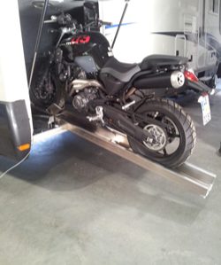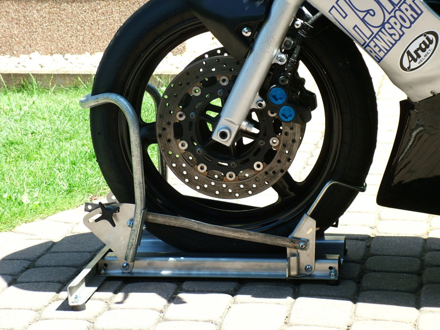 Motorräder mit Straßenbereifung und "feineren" Stollen sind mit den Motomove Radhaltern aus eigener Produktion bestens bedient.